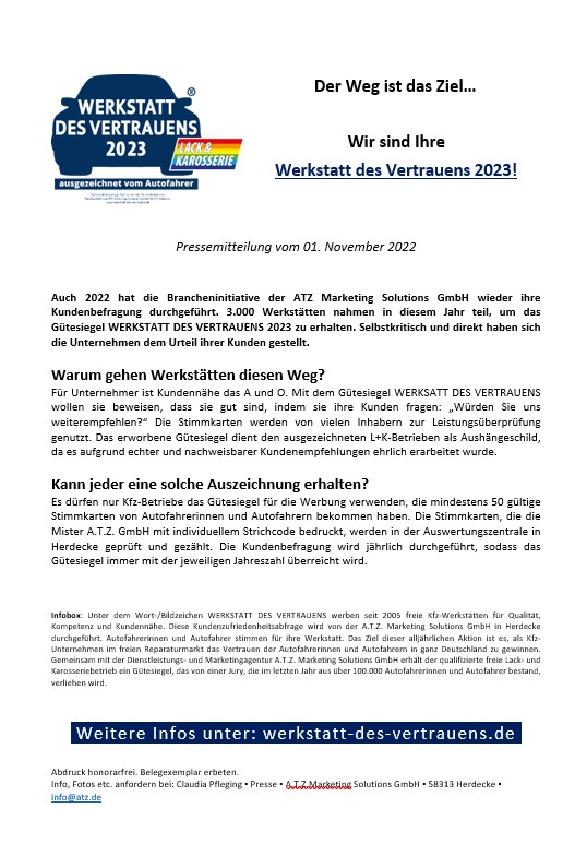 „Zufriedenheitsabfrage 2022 bei Kunden Freier Werkstätten, Durchgeführt von ATZ Marketing Solutions GmbH, 58313 Herdecke, www.werkstatt-des-vertrauens.de“